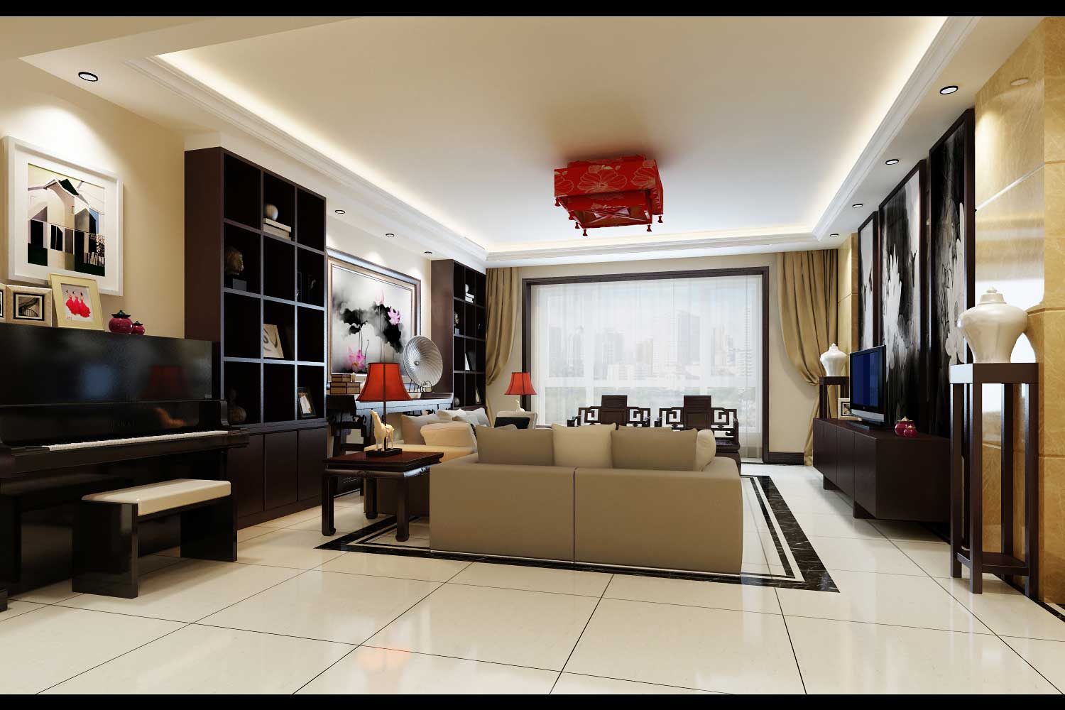 以現(xiàn)代的裝飾手法和家具,結(jié)合古典中式的裝飾元素,來(lái)呈現(xiàn)亦古亦今的空間氛圍。中式風(fēng)格的古色古香與現(xiàn)代風(fēng)格的簡(jiǎn)單素雅自然銜接,