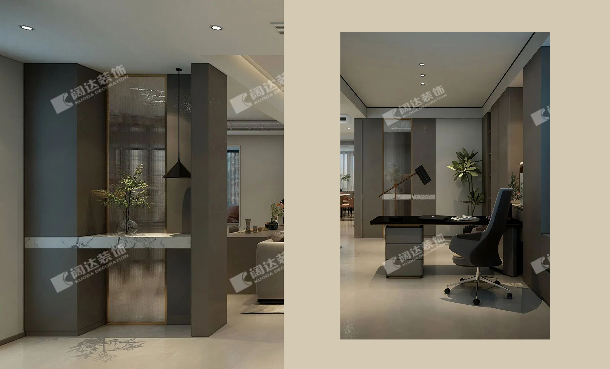 在整個空間中,不論是客廳、書房還是臥室都用了木色格柵鋪墊;一門到頂?shù)墓耋w、木門等看似簡潔的造型和搭配,延展出優(yōu)雅的調(diào)性,讓居住者輕易感受到生活的真趣。
