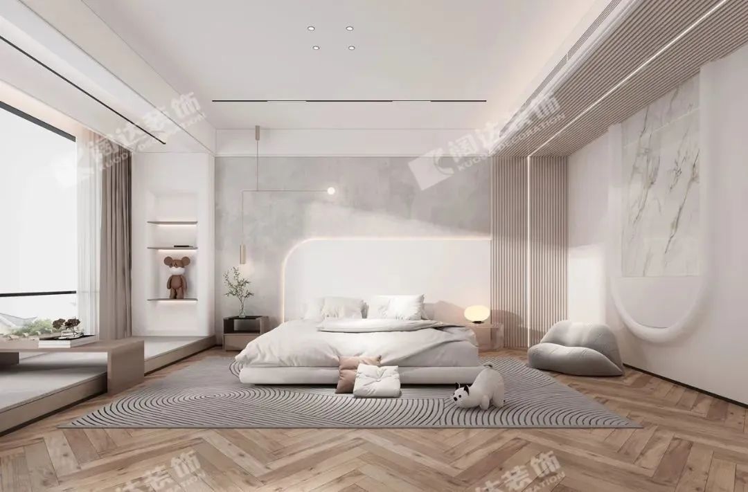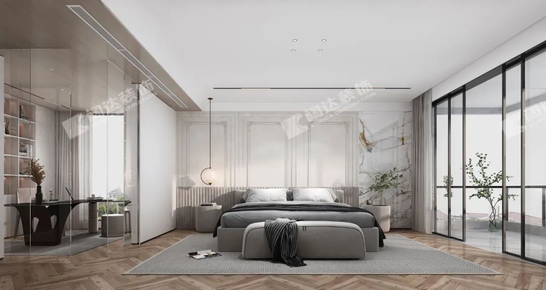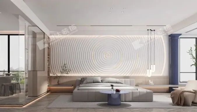 主臥整體空間由低飽和度的顏色組成,背景墻的軟包柔軟細(xì)膩,予人冷靜安謐的視覺(jué)感受。