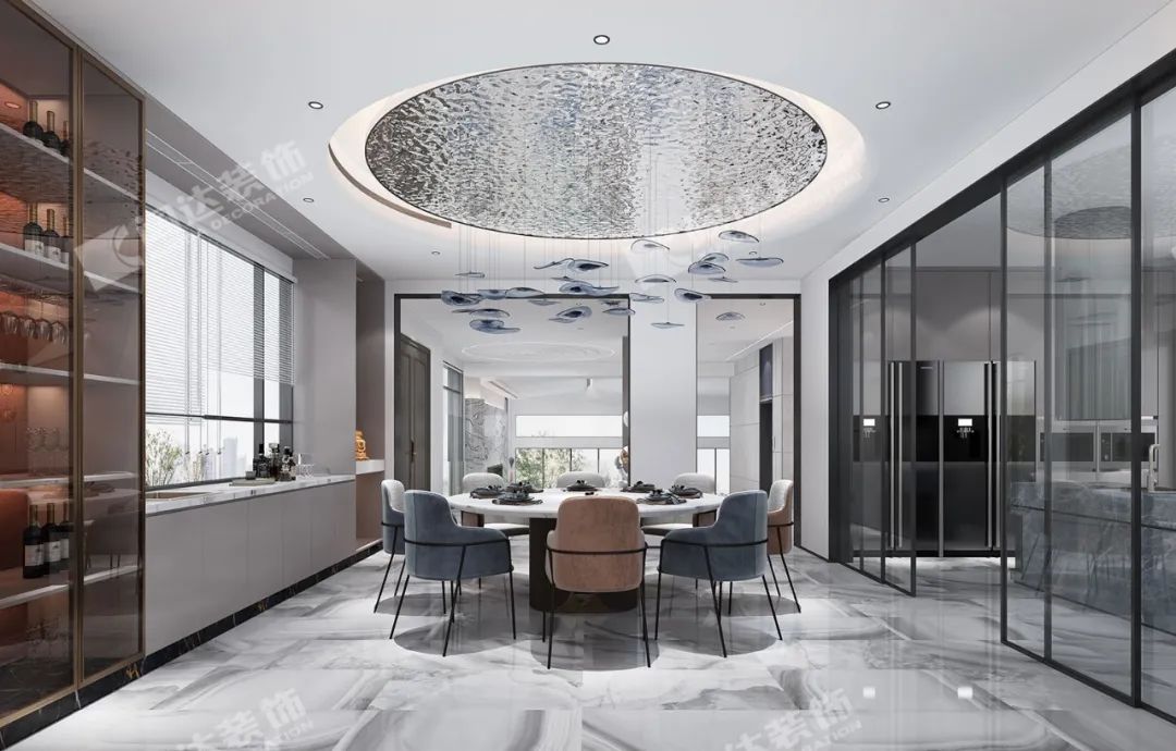 淺色系的餐廳搭配深色系的家具軟裝,金屬吊頂和水晶燈的搭配,整個(gè)餐廳給人一種優(yōu)雅、輕奢的感覺(jué)。