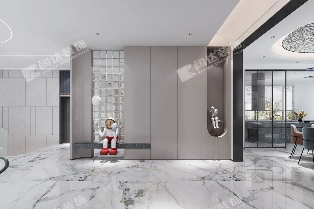 玄關(guān) 將大理石的光澤、木飾面的溫潤(rùn)、玻璃的紋理交織在光影中,打造了簡(jiǎn)潔、大氣、舒適的居家環(huán)境。