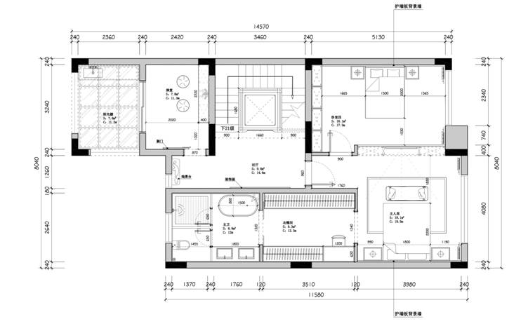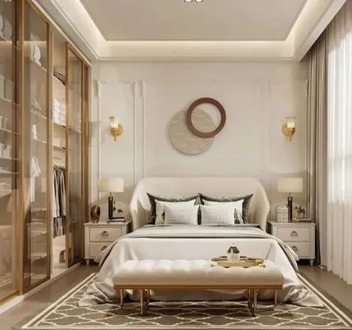主人房:亞麻色的墻面因為石膏線的加入增加了不少立體度,搭配低飽和度顏色,也能打造出不一樣的視覺感受,適度加一點角花裝飾,提升層次感的同時,盡顯優(yōu)雅。