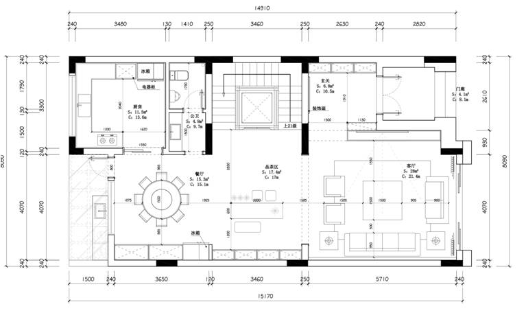 一樓通過改造擴大了餐廳面積,同時新設(shè)了茶區(qū)的功能。色彩和材質(zhì)的搭配讓整個空間更明亮干凈。