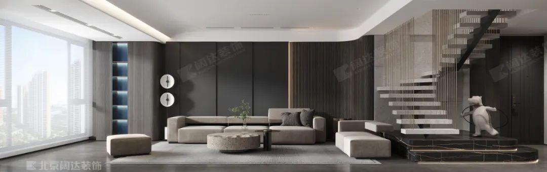客廳以木質(zhì)和黑白灰為基調(diào),空間強(qiáng)調(diào)色彩的沉靜和造型線條的簡(jiǎn)潔。落地窗將充盈的自然光引入室內(nèi),使客廳寬敞明亮。簡(jiǎn)潔干凈的塊面和線條營(yíng)造出空間的溫暖與愜意。