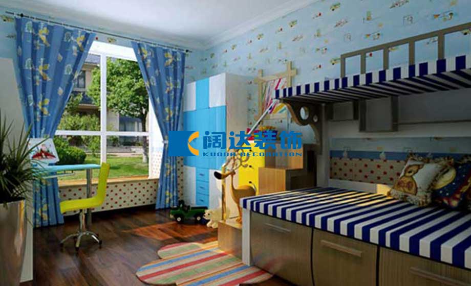 兒童房:以天藍色的整體色調(diào)和實木家具的搭配,給孩子營造出健康陽光的休閑和學習空間。