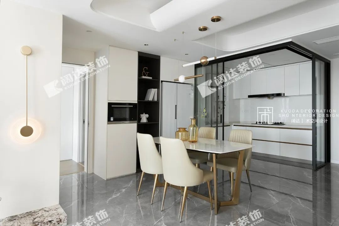 造型優(yōu)雅的弧形沙發(fā),小體量的圓弧天花,讓整個房子有了一絲靈動、甜美的印象。餐桌上方的“比翼雙飛“天花,象征美好的愛情,通過技術(shù)處理,弱化了餐桌上的橫梁。